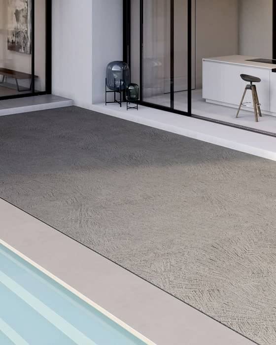 Kuvars bazlı bir toz ve su bazlı bir polimerden oluşan karışım, iki kat halinde mala ile uygulanır ve son zımparalama, derinliği ve hareketi ortaya çıkarır.